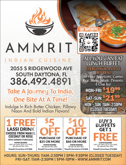 Ammrit Indian Cuisine offers a warm, inviting dining experience in South Daytona, Florida, featuring traditional Indian recipes prepared with rich spices and time-honored techniques. Designed for both newcomers to Indian food and longtime fans, Ammrit delivers bold flavors in a comfortable, family-friendly setting.
