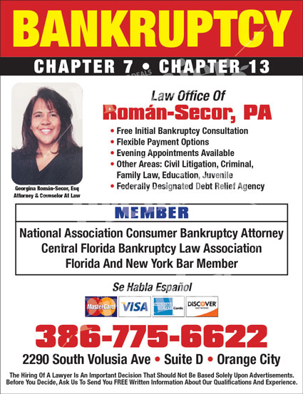 Law Office of Román‑Secor, PA provides experienced legal representation for individuals seeking relief through Chapter 7 and Chapter 13 bankruptcy. Serving clients throughout Central Florida, the firm focuses on helping people regain financial stability through clear guidance, compassionate service, and effective legal strategies.