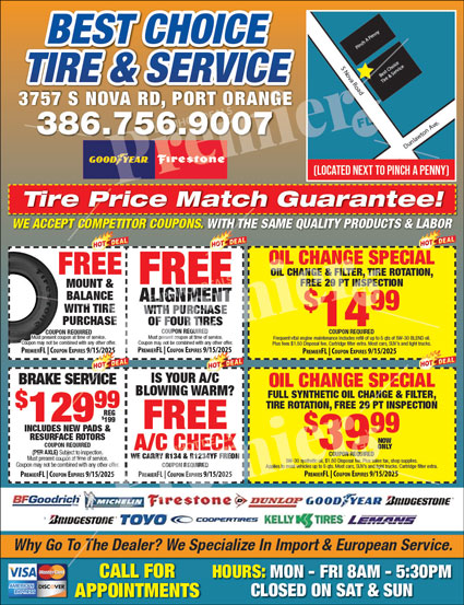 From routine oil changes and brake inspections to A/C recharges and safety diagnostics, Best Choice Auto Care makes it easy and affordable to maintain your vehicle year-round. Their goal is to deliver dealership-level quality at neighborhood-friendly prices. With their tire price match guarantee and acceptance of competitor coupons, you’ll always get the best value for your automotive services in Port Orange.