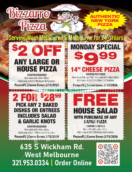 Bizzarro Pizza is a longtime local favorite serving authentic New Yorkโstyle pizza in West Melbourne, Florida. With over two decades of experience, Bizzarro Pizza is known for its classic recipes, generous portions, and casual atmosphere that keeps families, locals, and pizza lovers coming back.