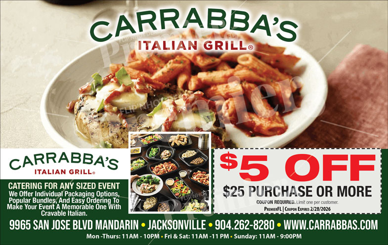 Take advantage of special savings and enjoy $5 off purchases of $25 or more. Visit the Mandarin location today and experience classic Italian dishes made with quality ingredients and passion.