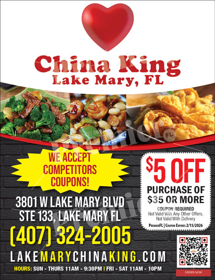 Conveniently located on West Lake Mary Boulevard, China King welcomes dine-in and takeout guests and even accepts competitor coupons. With friendly service, affordable pricing, and dependable quality, itโs a trusted neighborhood spot for anyone searching for Chinese food in Lake Mary.