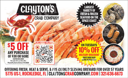 Located on U.S. 1 in Rockledge, Clayton’s Crab Company is a go-to seafood market for locals and visitors alike. With decades of experience and a reputation for excellence, Clayton’s continues to be a trusted source for fresh seafood throughout the Space Coast.