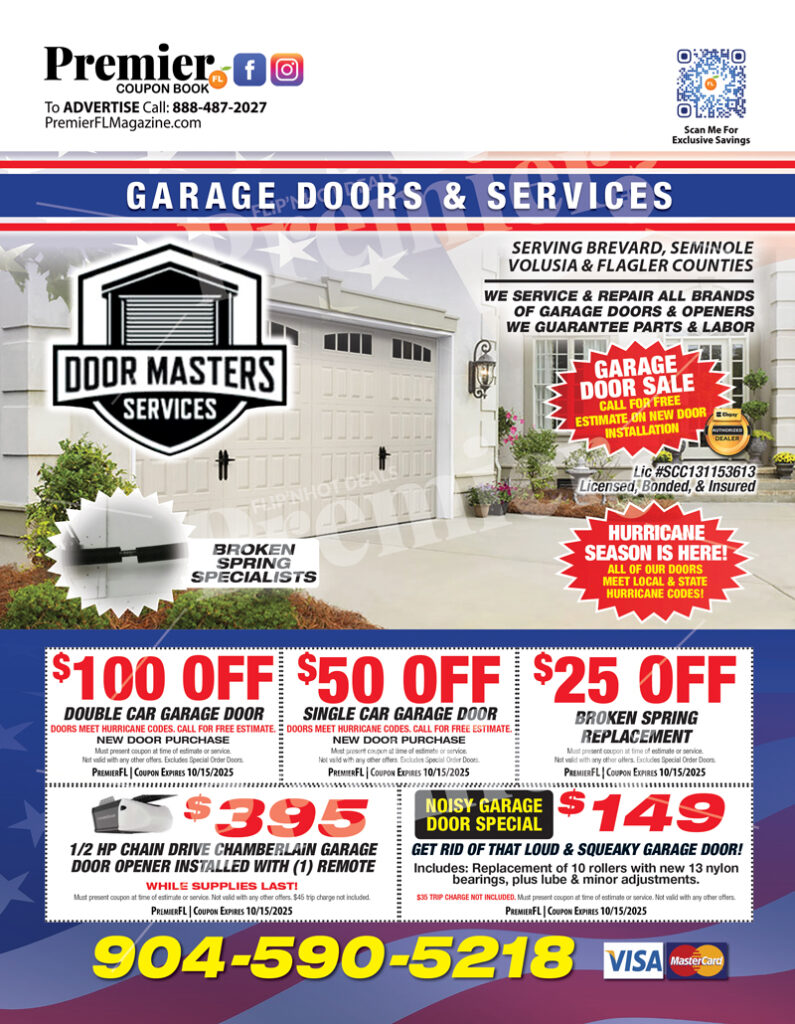 Serving homeowners across Northeast and Central Florida, Door Masters Services provides professional garage door repair, installation, and maintenance. Their team guarantees expert craftsmanship, durable materials, and hurricane-code compliant doors that meet Florida standards.