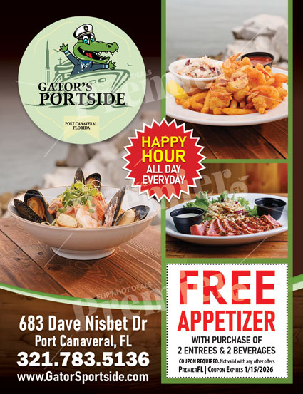 Conveniently located on Dave Nisbet Drive in Port Canaveral, Gatorโs Portside is ideal for casual lunches, dinners, and social gatherings. With friendly service, generous portions, and a welcoming waterfront vibe, itโs a must-visit destination for anyone looking for relaxed Florida dining near the port.