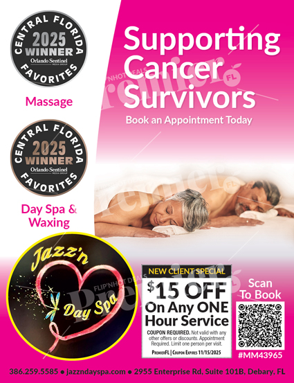 Voted a Central Florida Favorite for massage and day spa services, Jazzโn provides personalized care that restores balance to both body and mind. Their compassionate approach and elegant atmosphere make every visit rejuvenating.