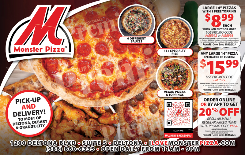 Monster Pizza offers convenient pick-up and fast delivery to most of Deltona, DeBary, and Orange City.