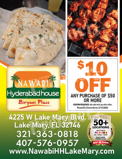 Conveniently located in Lake Mary, Nawabi Hyderabadhouse combines authentic cuisine with friendly service in a welcoming atmosphere. Whether youโre craving classic biryani or exploring Indian cuisine, the restaurant provides a satisfying and memorable dining experience.