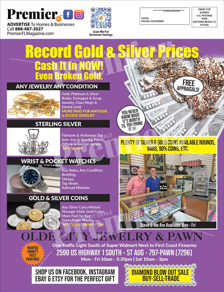 Olde City Jewelry & Pawn is St. Augustineโs trusted destination for buying, selling, and trading fine jewelry, coins, watches, and antiques. Known for honesty and expertise, they provide fair appraisals and top market payouts for gold, silver, and estate pieces โ even if theyโre broken or worn.
