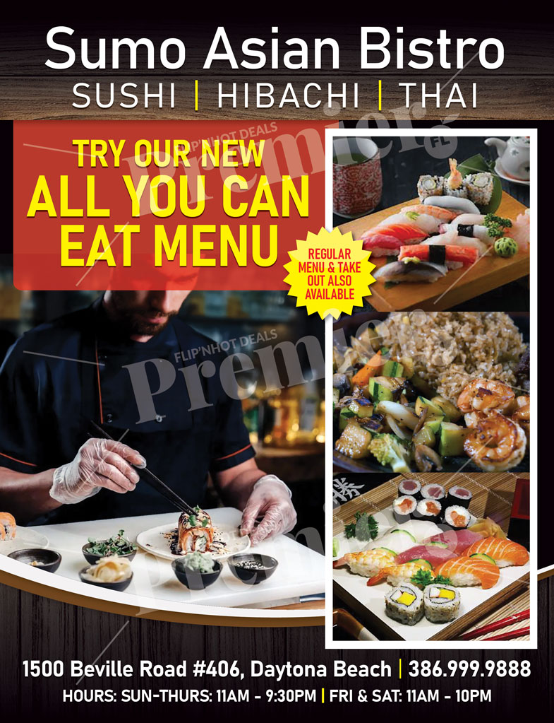 Discover Daytona Beach’s newest Asian fusion restaurant — Sumo Asian Bistro. Enjoy expertly prepared sushi rolls, flavorful hibachi, and authentic Thai dishes made fresh daily. Whether you dine in or take out, every meal delivers a perfect blend of taste, style, and value.